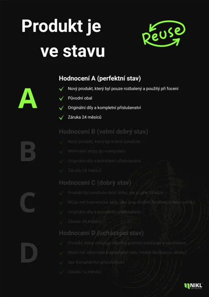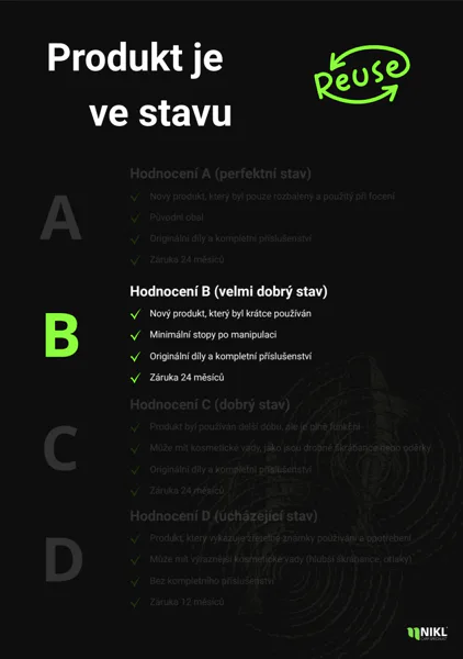 Produkt je ve špičkovém stavu, většinou pouze rozbalený nebo velmi málo použitý, takže je prakticky bez jakéhokoliv viditelného opotřebení či známek používání. Pokud hledáte možnost pořízení ReUse zboží s pocitem, že je zcela „jako nové“, pak je právě tento produkt tou nejjistější a nejvhodnější volbou, která vám zajistí maximální spokojenost a kvalitu.
