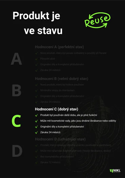 Nikl ReUse je projekt, který dává druhou šanci kvalitnímu vybavení, jež je stále plně funkční a spolehlivé, jen už nesplňuje podmínky pro prodej jako úplně nové zboží. Každý kus prochází pečlivou kontrolou a je jasně zařazen do stavu A–D, takže přesně víte, co kupujete a v jakém je stavu. Díky tomu získáte prověřené vybavení značky Nikl za výhodnější cenu a zároveň podpoříte udržitelnější přístup.