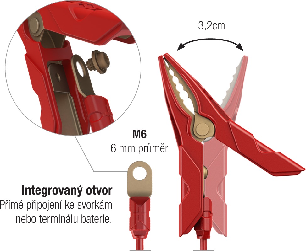 - svorky mají široký rozsah upnutí a zvýšenou upínací sílu pro lepší přenos napětí do baterie