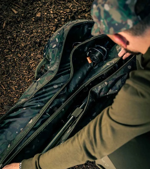 Dvoucestný, odolný hlavní zip zajišťuje rychlý a snadný přístup k vašim prutům a navijákům. Rozšířené části špiček, spojené s vnitřním polstrováním, pojmou bez problémů 50 mm očka a zajistí, že budou vaše pruty během přepravy chráněny. Každý prut je oddělen vnitřním, polstrovaným pouzdrem a zajištěn na místě pomocí vnitřních neoprenových pásků. K dispozici je i další popruh a elastická smyčka, kterou lze použít pro uložení kobry, takže i ona může těžit z polstrované ochrany. Nadrozměrná část pouzdra na naviják je silně polstrovaná a velkoryse dimenzovaná, aby ochránila i ty největší navijáky. Obě strany pouzdra NXC 3 Rod Sleeves mají velké vnější kapsy na zip, které jsou vhodné pro podběráky, vidličky a další příslušenství. Na zadní straně je na základně velká otevřená kapsa, kam můžete uložit další prut, který lze zajistit pomocí napínacích popruhů. Do další, menší otevřené kapsy na zip lze umístit podběrák nebo uložit distanční tyče. Hned pod hlavním zipem je úhledně umístěná kapsa na zip pro uložení olov.