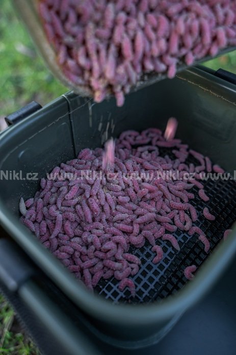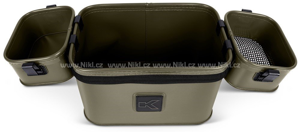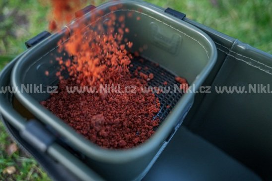 Uvnitř se nacházejí dvě vyjímatelné misky, z nichž jedna je opatřena 3 mm síťkou pro prosívání živých nástrah nebo krmiva. Tyto misky lze během používání upevnit zvenčí a vytvořit si tak prostornou pracovní plochu.