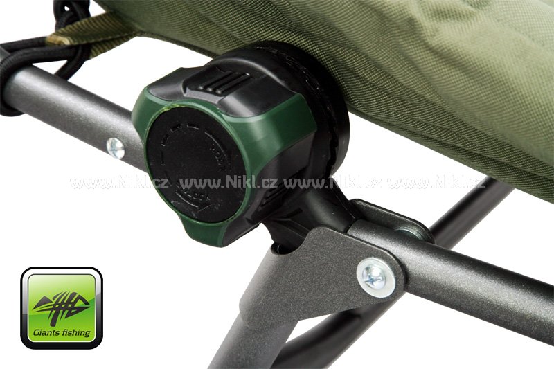 Nově tvarovaný a zesílený polohovatelný kloub pro nastavení podhlavníku. Vyrobeno z materiálu nylon 600D, v provedení světle zelené a černé barvy. Konstrukce je z pevných hliníkových trubek o průměru 22mm a 25mm s povrchovou úpravou v temně šedé metalické barvě.