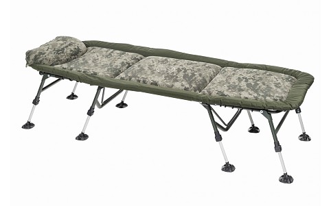Extrémně lehké, velké a 100% ploché lehátko ve velice atraktivním designu s digitálním maskováním. Nadstandardně silná a velmi komfortní matrace s fleecovou vrchní vrstvou nabízí nejúčinnější systém regulace tuhosti pomocí elastického šněrování na spodní straně. Další výhodou jsou nohy s rozměrnými výkyvnými patkami a možností velkého vysunutí. Lehátko je dostupné ve variantě s osmi nebo se šesti nohami.