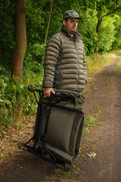 Přestože židle váží jen něco málo přes 6 kg, nabízí mimořádnou stabilitu a sílu. Patentovaný mechanismus nohou umožňuje extrémně rychlé rozložení – stačí stisknout tlačítko a noha automaticky zaskočí na své místo. Křeslo se také snadno uvolní a složí, což zaručuje pohodlnou manipulaci i přepravu. Nechybí ani suché zipy pro připojení úložné tašky k lehátku.