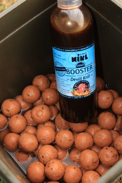 Při volbě krmení a nástrah jsem vsadil vše, ostatně jako vždy během podzimu, na atraktivitu Devill Krillu, kterému kapři v chladnější vodě nikdy neodolají. Lovné místo jsem zvolil v maximální odhozové vzdálenosti, tak aby mé nástrahy byly umístěny ve větší vzdálenosti, než nástrahy okolních rybářů. Krmil jsem jen samotným boiliem, které jsem po příjezdu k vodě zalil horkou vodou a nakonec zatraktivnil boostrem. Kvůli dalekým náhozům bylo nutné nasadit helikoptérové montáže od Carp´R´Us a oblíbený Blow back rig sestavený z fluorocarbonu Clearwater 25 lb, návazcové šňůrky Smooth Hooklink Braid, kroužku Rig rings a háčku Centurion ATS 2000 vel. 2. Jako nástraha pak sloužila samostatná nástraha, dipované Ready boilie Devill Krill 24 mm.