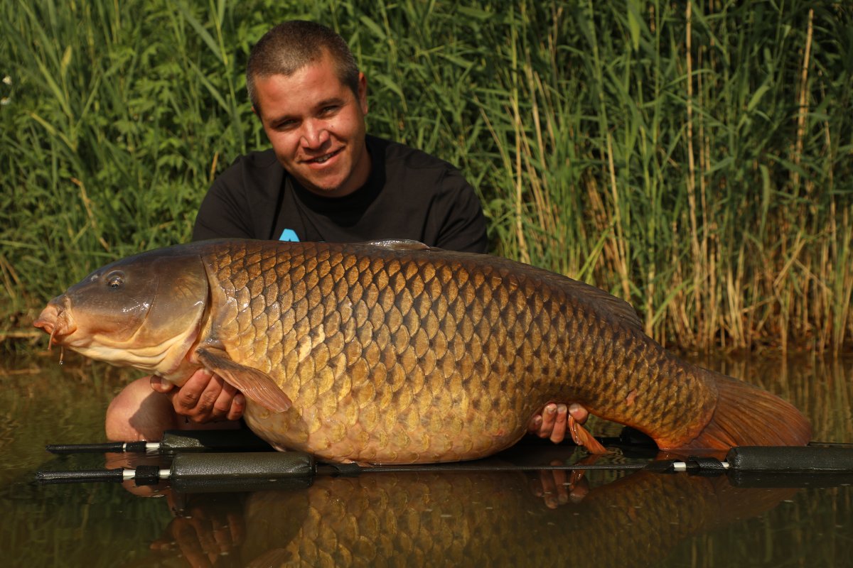 Ne že bych těmito kapry opovrhoval, to vůbec ne, ale chtěl jsem se dostat i na větší kusy. S krmením jsem nepolevoval a krmil v pravidelných dávkách. Jen své montáže jsem posunul o cca 15-20m mimo krmné místo. Tato taktika někdy funguje a někdy prostě ne. V tomto případě to ale byla ta správná volba. Záběrů rapidně ustalo, vlastně to byl první den, kdy nebyl záběr žádný. Byl jsem ale naprosto v klidu, jelikož jsem věděl co dělám. S rozedněním dostávám záběr a zanedlouho podebírám krásného šupináče s váhou 21kg. Když dám kapra do podložky rozjíždí se mi druhý prut. Kapra přikryji Renention Slingem a běžím obtěžkat druhý záběr. Netrvalo to ani minutu, kapr na podložce sebou plácl a byl fuč! Docela mě to zamrzelo, ale nějde přeci o život :-) Věnuji se zdolávání druhého prutu, kde to také nevypadá špatně. A je v podběráku! Vše mi vynahrazuje dlouhý mohutný šupináč s váhou 22,5kg. Po chvilce zjišťuji, že se jedná a známého kapra pískovny se jménem GIBON!