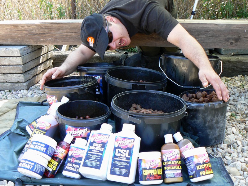 Letošní horkou novinkou firmy Vision Baits jsou Kapří bombony a Ecto-plasma, což byla také první Shimanskyho volba. Na jeden prut Pavel nabil Citrus fizz s Ecto-plasmou Scopex-Peach a na druhý stejné bombony, ale bez Plasmy.