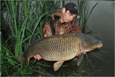 Odměnou zá Láďovo vynaložené úsilí se stal překrásný, téměř metr dlouhý šupináč s obrovskou ocastní plotví, který Láďu příjemě potrápil úžasným soubojem. Láďa měl z tohoto úlovku jaksepatří velikou radost. :-) Tento kapr, stejně jako i další, které se Láďovi podařilo ulovit, zabral na 2 kuličky boilie RRR Pepper- Kolínský losos v průměru 24mm, prezentované na kombinovaném návazci z 25lb Clearwater Fluorocarbonu a 25lb Smooth, zakončené háčkem Longshank Nailer č.8, dopněného o čirý Mouthsnagger a navázaný s jezdícím kroužkem jako blowback rig.