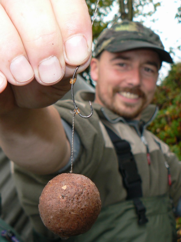 Jedno z míst, které Karel vyzkoušel, se nacházelo kousek od břehu v 9ti metrové hloubce s čistým dnem. Sem umístil své nejoblíbenější boilie 3XL ve velikosti 30mm a kolem nástrahy na několik čtverečních metrů rozházel zhruba 10 dalších kuliček 3XL-ka.