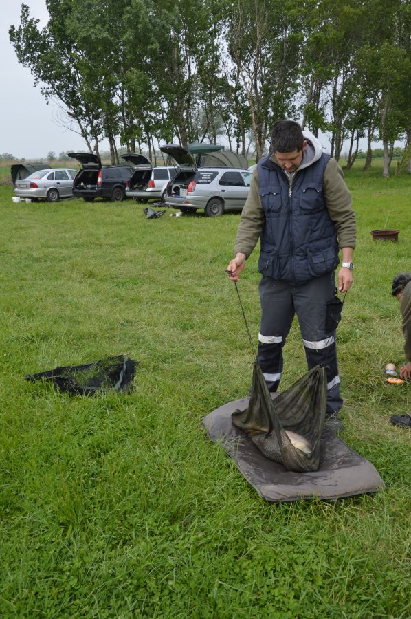 Jeden z mnoha záberov, kedy sa pri paliciach obšmieta Paťo. Kričí mi, „Záber, záber“. Ja mu naspäť. „Dvihni palicu a toľko natoč, koľko povolí ryba od seba.“ Seká a následne ťahá kapra. Z ťahu som vedeľ že to nebude nič malé, preto som mu trocha dopomohol. Uvolnil som mu cievku. Následne mu dal 2 sekundovu inśtruktáž a už to išlo. Na palicu s Hard hookers - extra tvrdé nástrahy Devil Krill vyťiahol kapra o váhe 12 kg.
