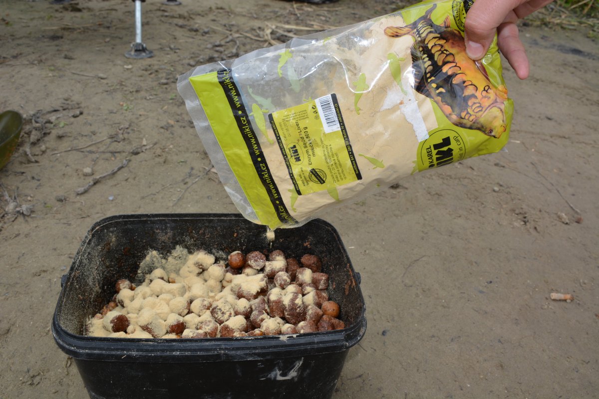 Háčky volímLongshanky č. 6, dále doplňuji mouthsnagerem a jako šňůrku volím Strip-X. Na jeden návazec navlékám 21mm Extasy a na druhý 21mm Krilla naloženého několik dní v Krill Liquidu. Krmení se skládá s tygřáku, pelet a boilie stejných příchutí, na které chci chytat, pouze vše zalévám liquidem a zasypávám dávkou sušených jater. Do člunu dávám nejdůležitější věci, abych mohl hned po podebrání ryby znovu montáž položit.